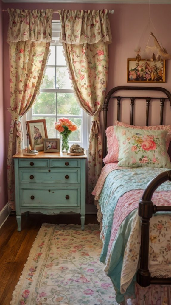 The vintage chic bedroom combines old-world charm with modern functionality, and honestly? It might be the most timeless option on this list. Whether you go full Victorian, mid-century modern, or 70s retro, vintage style adds character that manufactured furniture just can’t match.