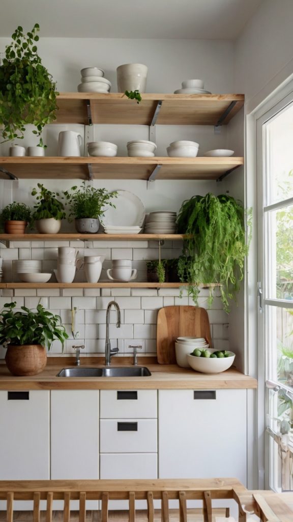 Picture this: white floating shelves against a sage or forest green wall, styled with white dishes, green glassware, and maybe some potted herbs. The key is creating intentional displays that look effortlessly curated (even though we both know you spent three hours arranging those bowls just right).