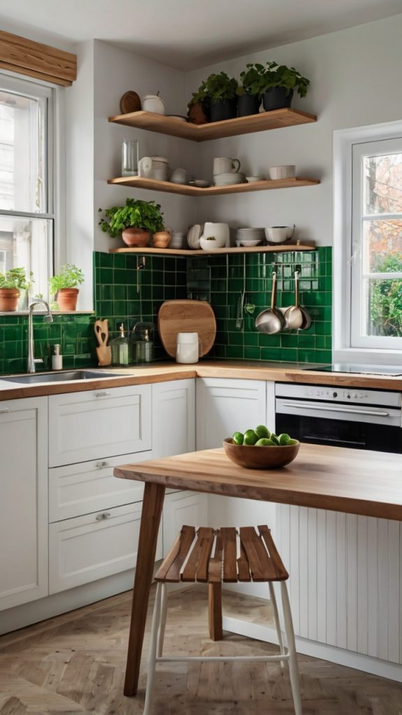 Think about it – maybe you paint one accent wall in deep emerald, or create a green tile feature wall behind your stove. Perhaps you go subtle with green-tinted white paint that reads differently throughout the day. The possibilities here are endless, and most importantly, totally reversible if you change your mind.