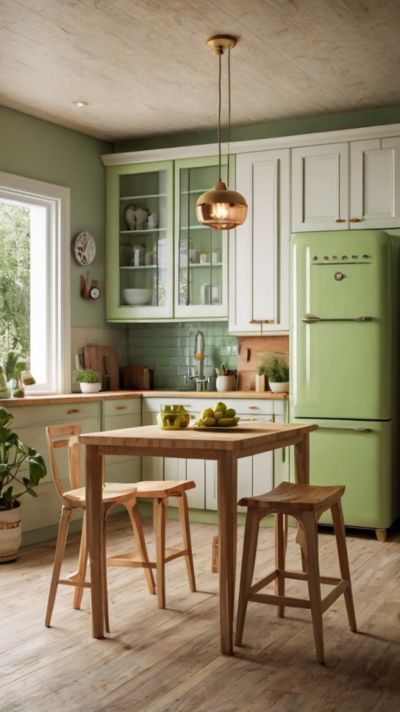 Who says appliances have to be boring? Pistachio green appliances against white cabinets create this retro-meets-modern vibe that’s having a serious moment right now.