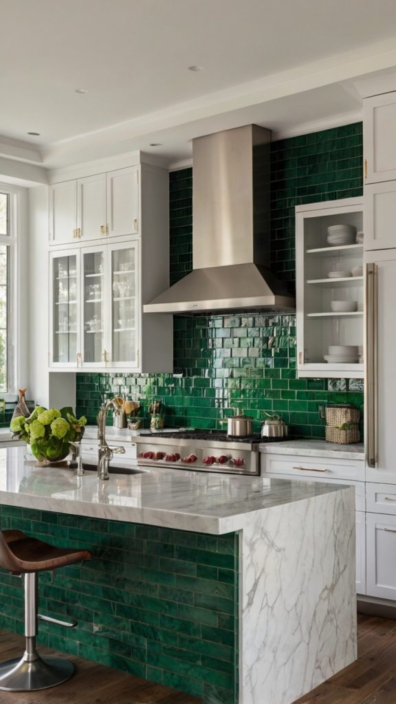 What really sells me on emerald subway tiles is their ability to work with both light and dark cabinetry. White cabinets? The green pops like crazy. Dark wood? You get this moody, elegant vibe that feels straight out of a design magazine. Plus, the classic subway pattern means you won’t get tired of looking at it in five years.