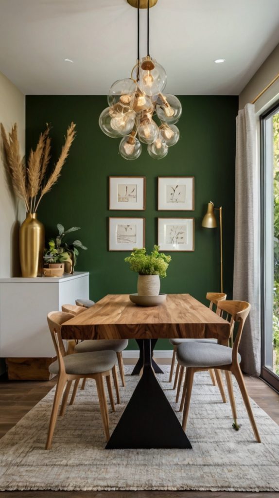 Which wall should go green? Usually, the wall behind your dining table or buffet works best. It creates a natural backdrop for your dining setup and doesn’t overwhelm the space. Skip the wall with windows—natural light can make paint colors look different throughout the day.