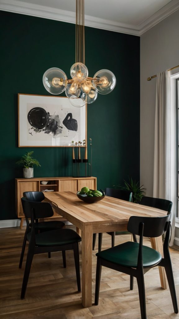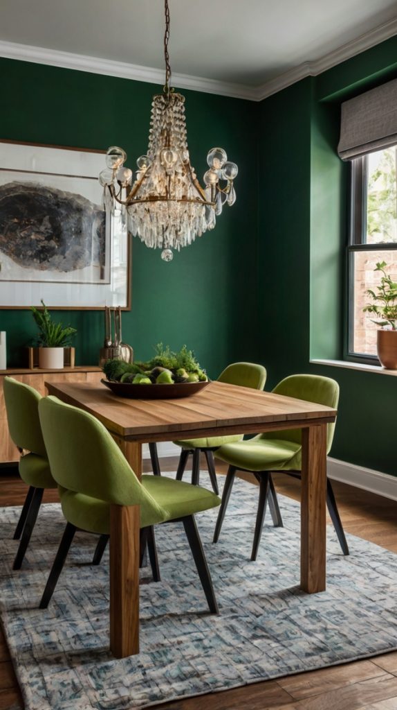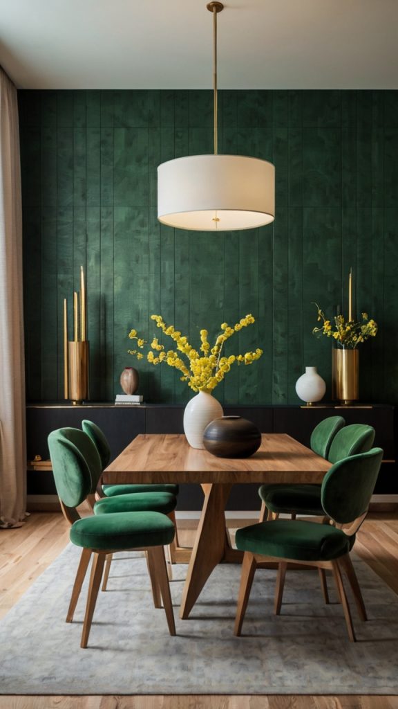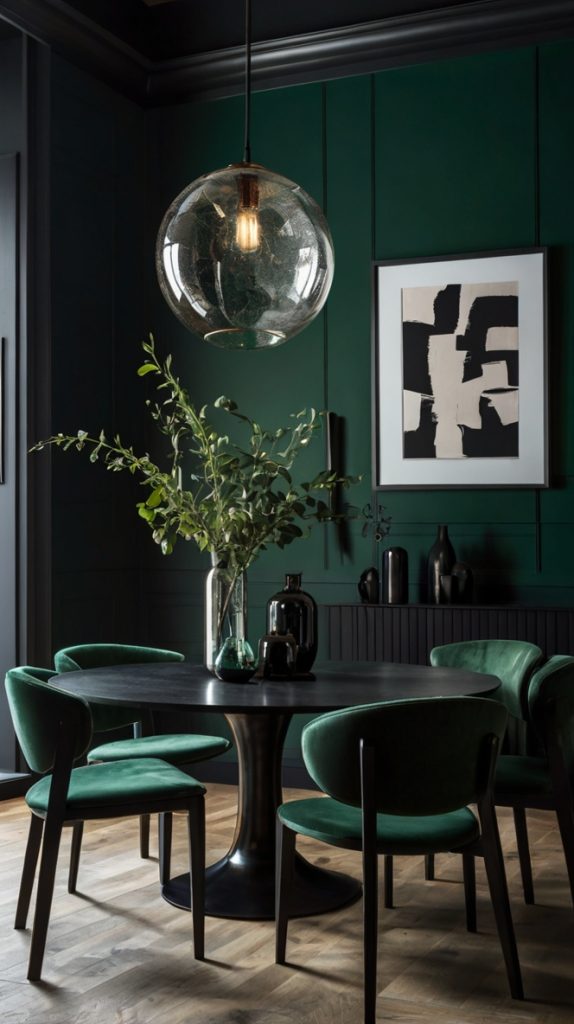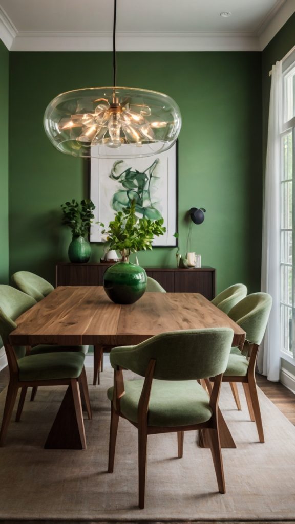 What makes emerald special? It works in both traditional and modern settings. Throw in some velvet dining chairs, and you’ve got yourself a room that feels like it belongs in a luxury hotel. Add contemporary art and sleek furniture, and suddenly it’s urban chic.