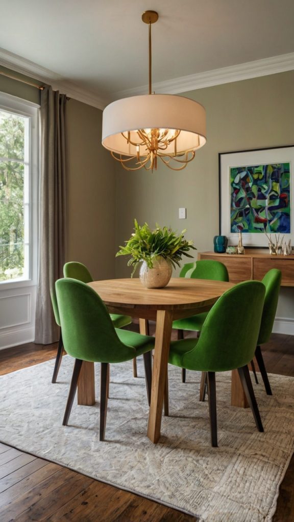 Sometimes the smartest green move involves no paint at all. Green dining chairs in an otherwise neutral room create impact without commitment. This approach lets you love green without living in it 24/7.