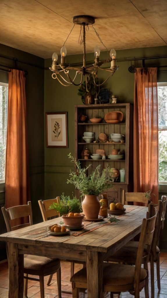 This shade works magic with rustic elements. Exposed wooden beams? Perfect. Farmhouse table? Even better. Olive green basically turns your dining room into that charming European countryside restaurant you’ve always dreamed about.