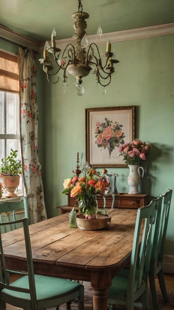 Pastel green and vintage vibes go together like coffee and mornings—perfectly natural and oddly comforting. This softer approach to green creates nostalgic dining rooms that feel both fresh and familiar.