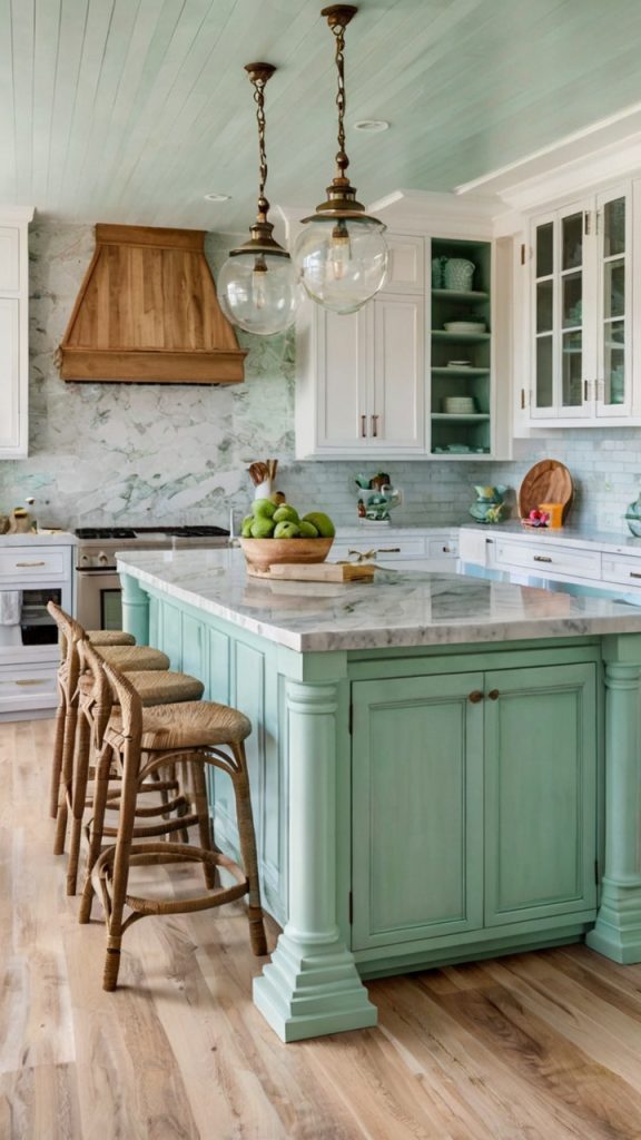 Want your kitchen to feel like a permanent beach vacation? A seafoam green island delivers those coastal vibes without going full nautical theme park.