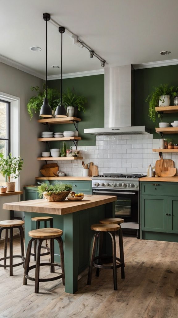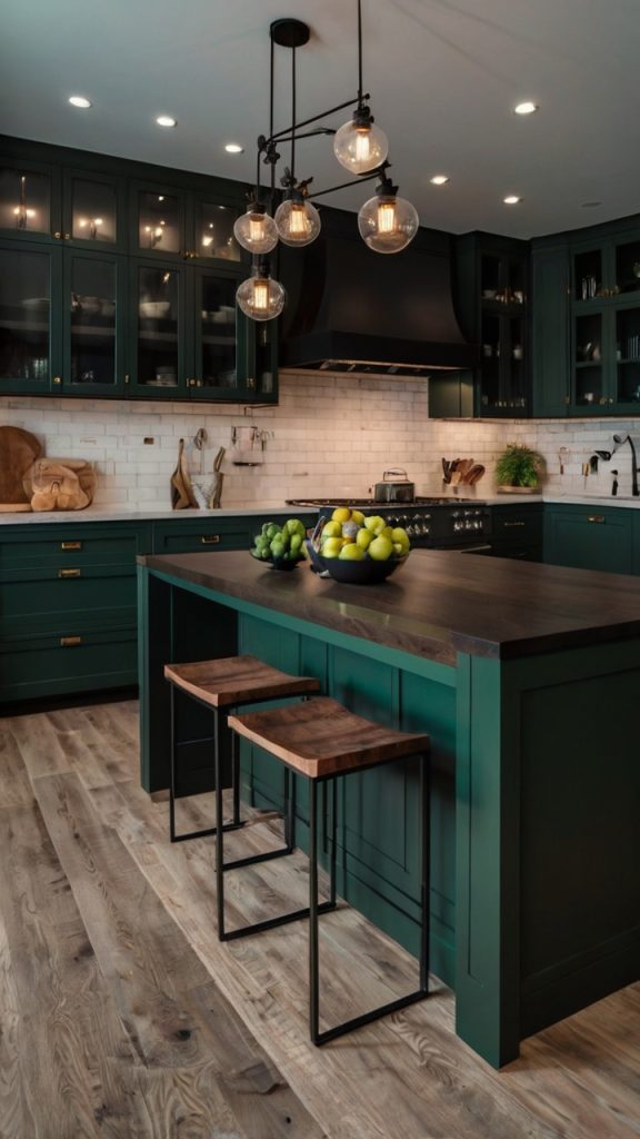 This color works amazingly in open-concept homes where the kitchen flows into living spaces. The deep green acts like a beautiful focal point that ties everything together.