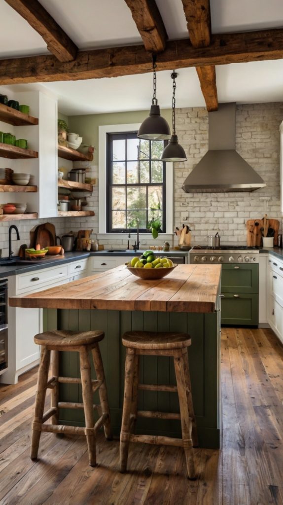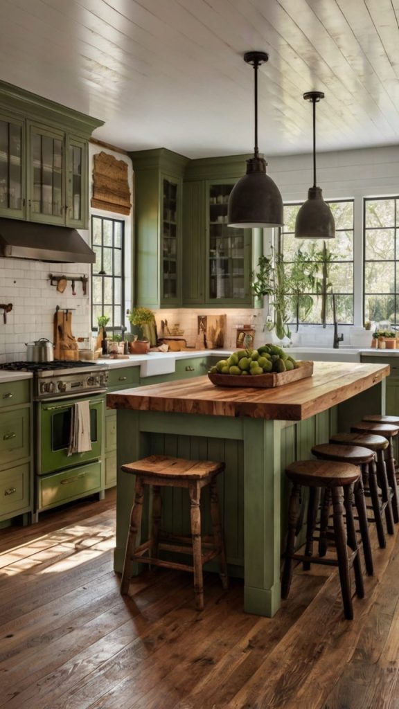 Last but definitely not least, let’s talk about the rustic green island with a butcher block top. This combination brings warmth and functionality that makes everyone want to gather in your kitchen.