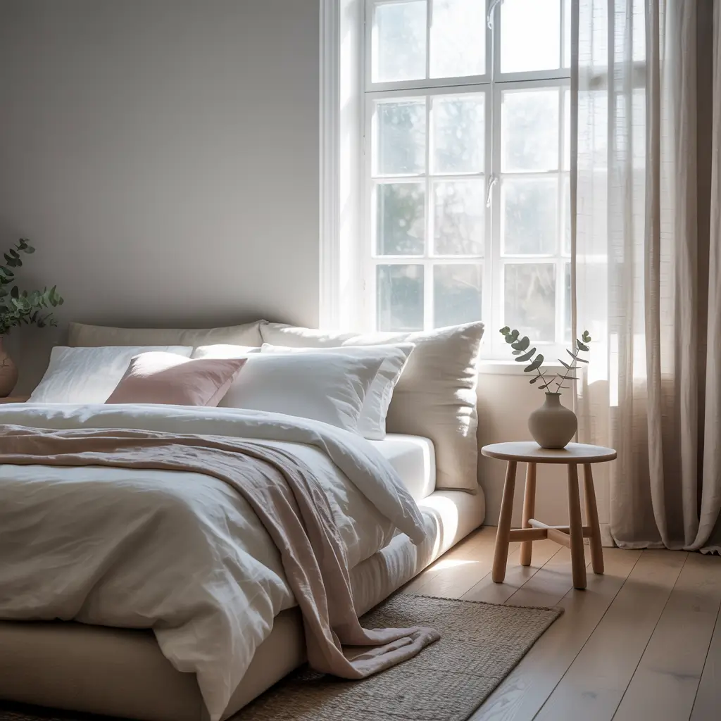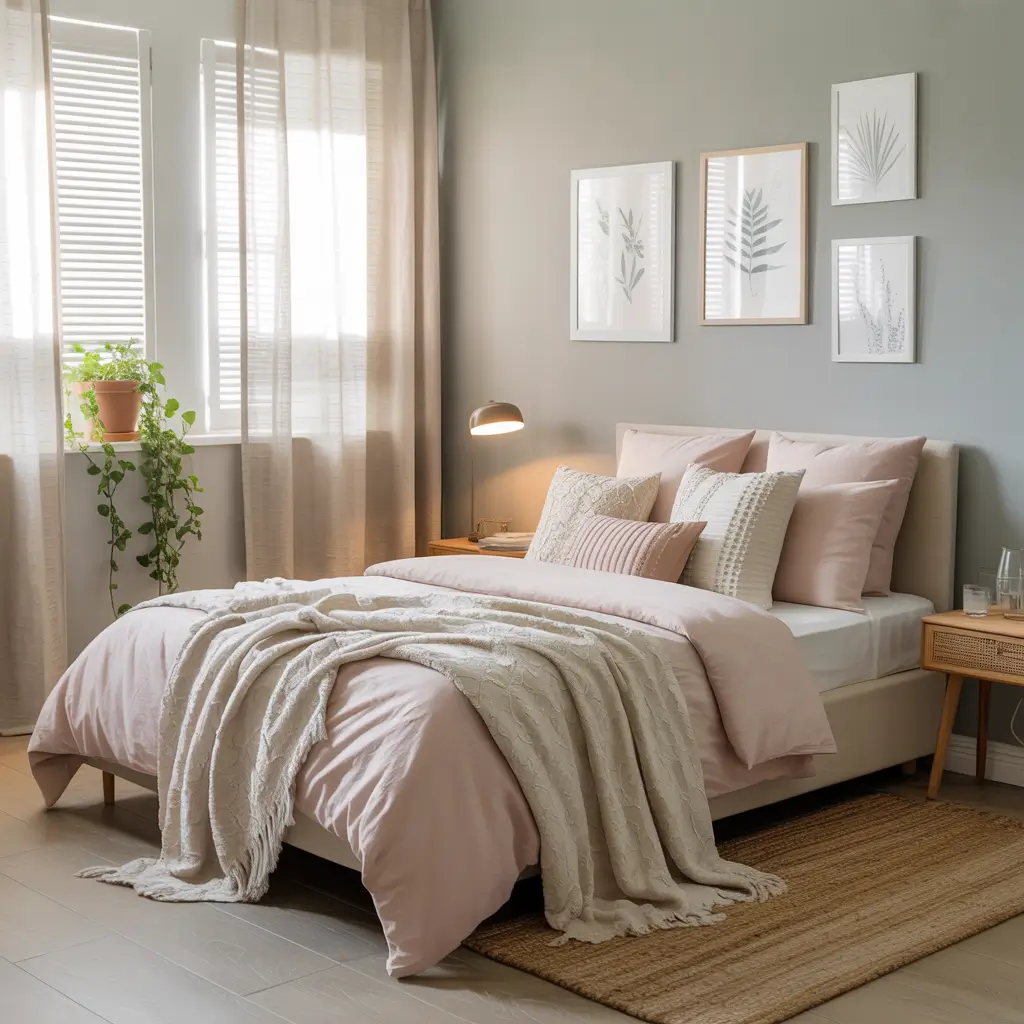 White walls with grey bedding and pale pink accents create that signature Scandi look. Add natural wood furniture, cozy knit throws, and maybe a sheepskin rug for texture. The overall vibe? Clean but lived-in, stylish but comfortable.