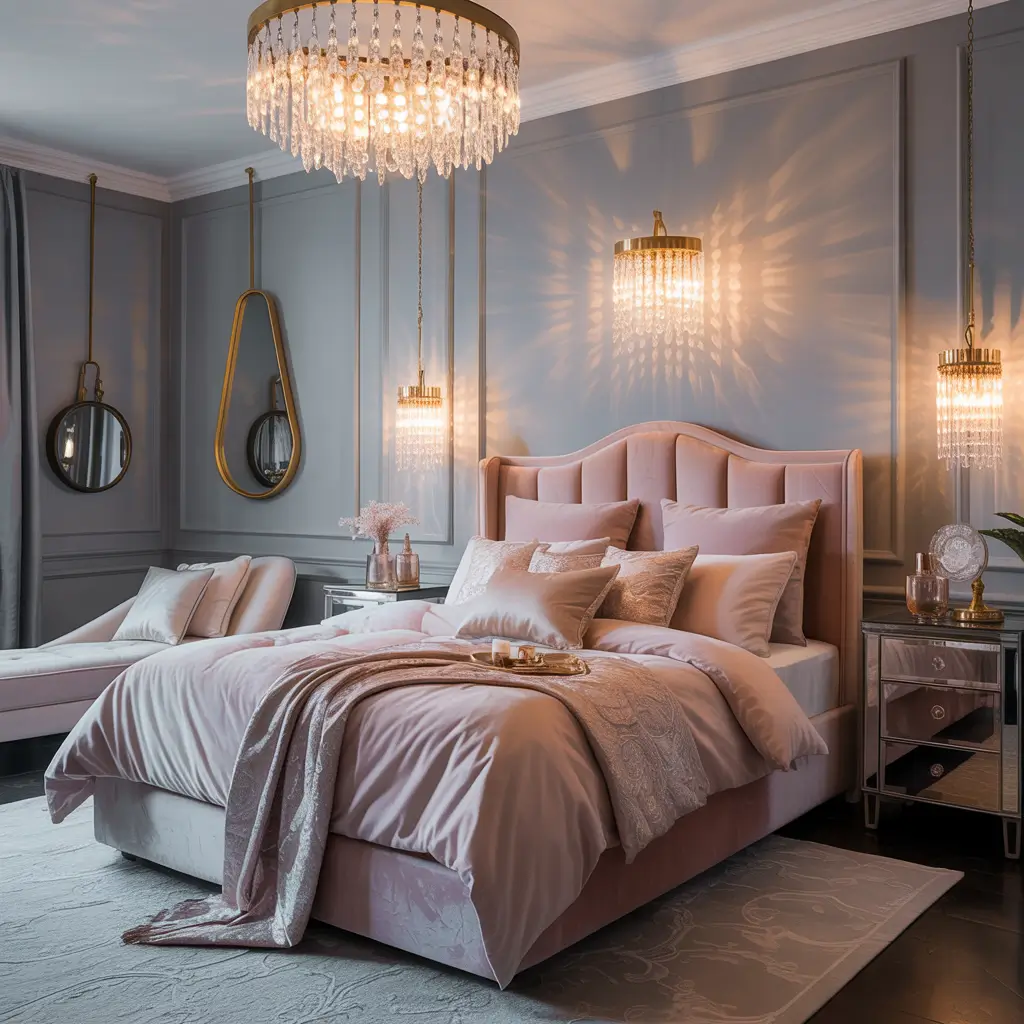 Picture this: charcoal grey walls, a tufted blush pink headboard, and gold hardware everywhere. Add a chandelier (yes, in the bedroom!), mirrored furniture, and silk curtains that puddle on the floor just a bit. Is it practical? Not really. Does it make you feel like royalty? Absolutely.