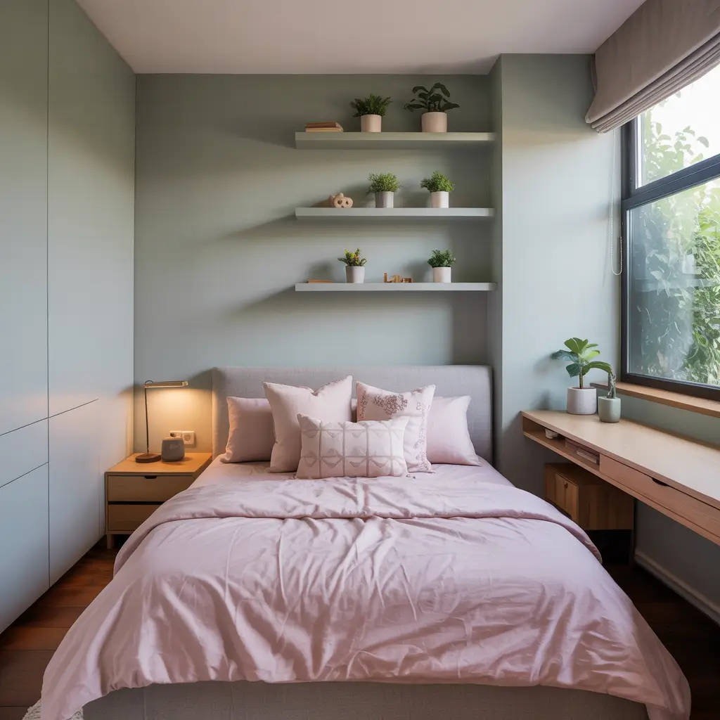 Light grey walls are your best friend here – they reflect light and create the illusion of space. Use pink as an accent color through removable wallpaper on one wall, or stick to accessories you can easily swap out. Multi-functional furniture is key: ottoman storage benches, wall-mounted desks, and beds with built-in drawers.