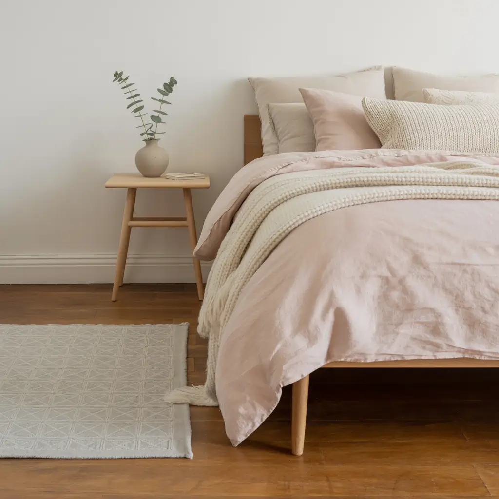 Wood furniture in natural finishes, jute rugs, linen bedding, and live plants all work beautifully. I love how a simple wooden bench at the foot of the bed can warm up the whole room. Add pink through natural elements too – pink himalayan salt lamps, rose quartz crystals, or dried pink flowers.