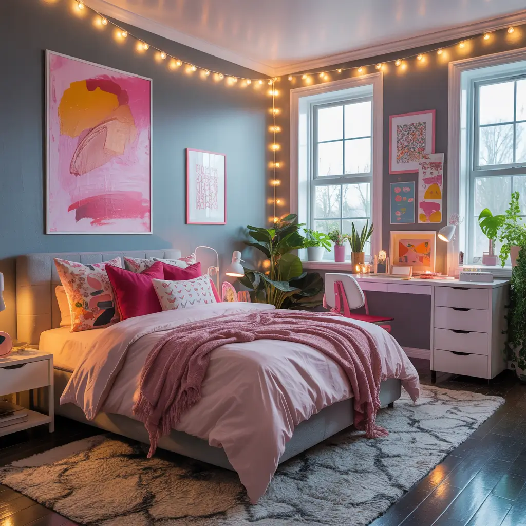 Go for edgier shades – charcoal grey with hot pink or dusty pink with slate grey. Add personality through wall decals, LED strip lights (they’re obsessed, trust me), and gallery walls featuring their interests. Give them spaces for both sleep and hanging out with friends.