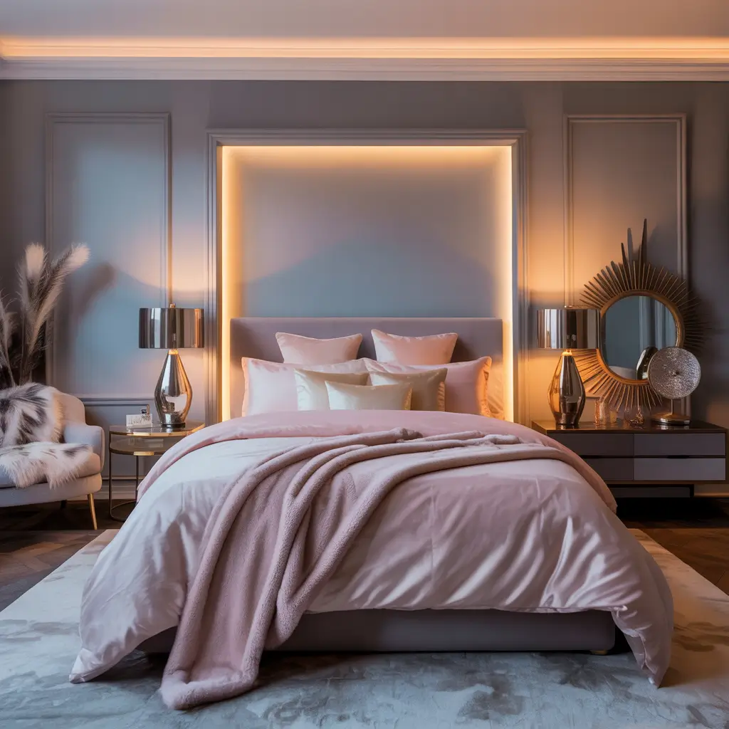 I’m talking about crisp white walls with one accent wall in soft grey. Then you add pink through small, intentional touches – maybe a blush throw pillow here, a rose gold lamp there. The key? You pick furniture with sleek profiles and no unnecessary details.