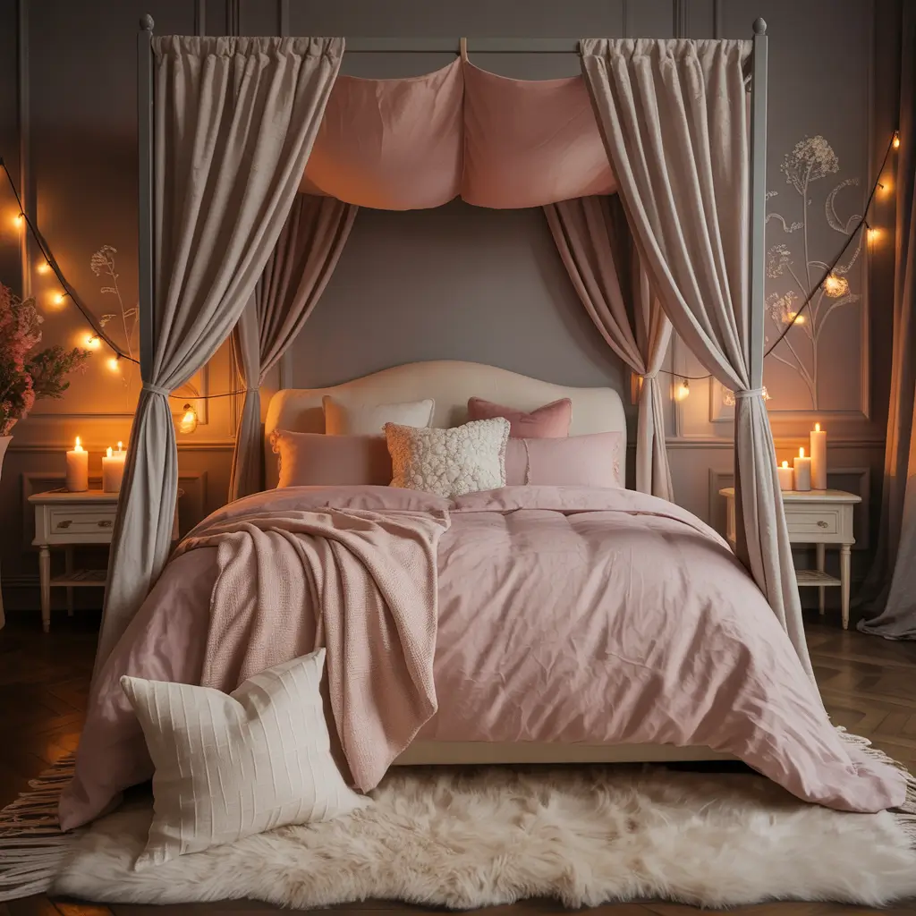 Soft, muted tones work best here – dove grey with blush pink creates an intimate atmosphere. Layer in romantic elements: flowing curtains, a canopy bed or draped fabric, fresh flowers (or good fakes), and lighting you can dim. Don’t forget the seating area where you can actually enjoy morning coffee together!