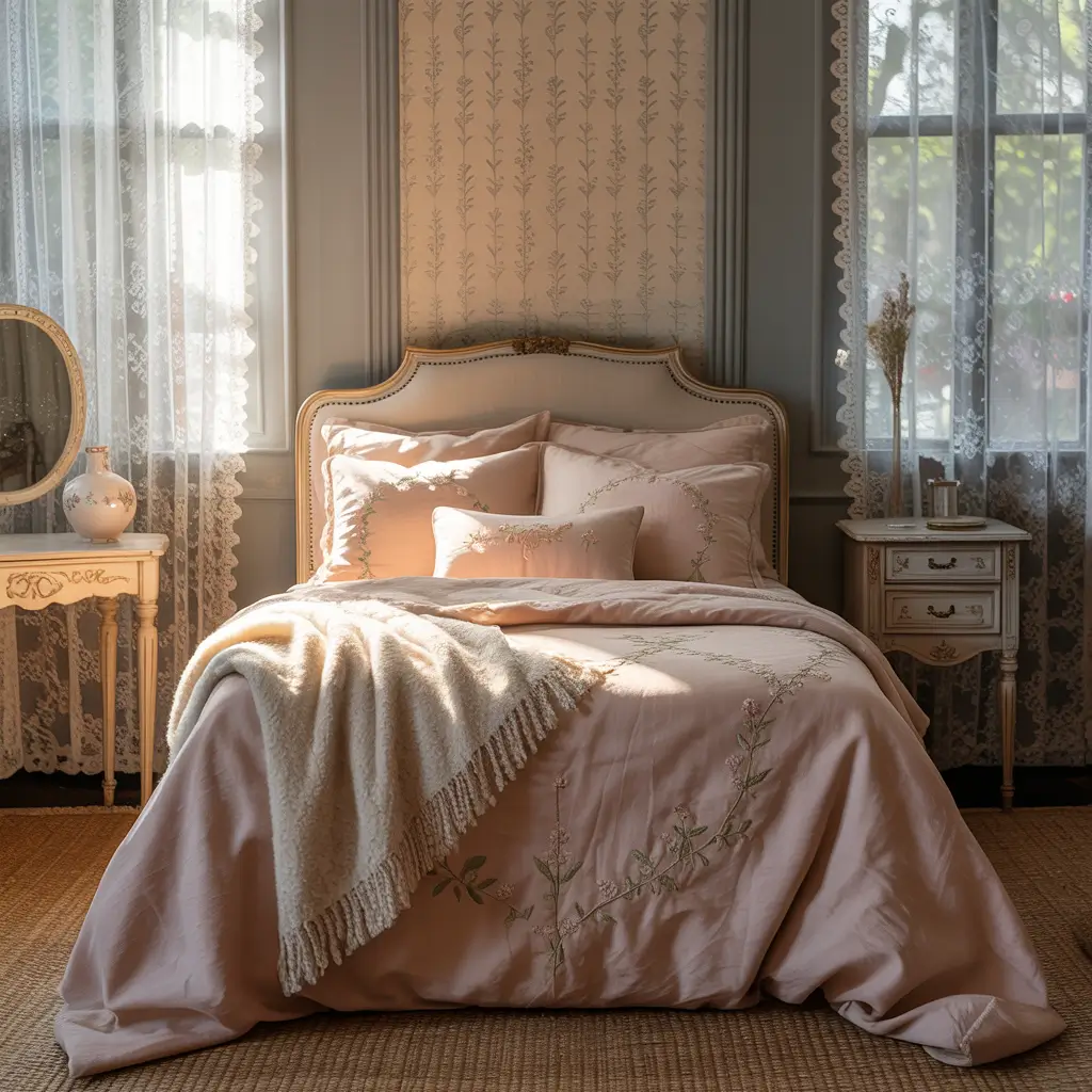 Hunt for vintage pieces in soft grey or pink tones – an old vanity, antique mirror, or vintage trunk at the foot of the bed. Mix different eras if you want; Victorian meets mid-century modern? Why not! Paint old furniture in chalk paint for that shabby chic finish.