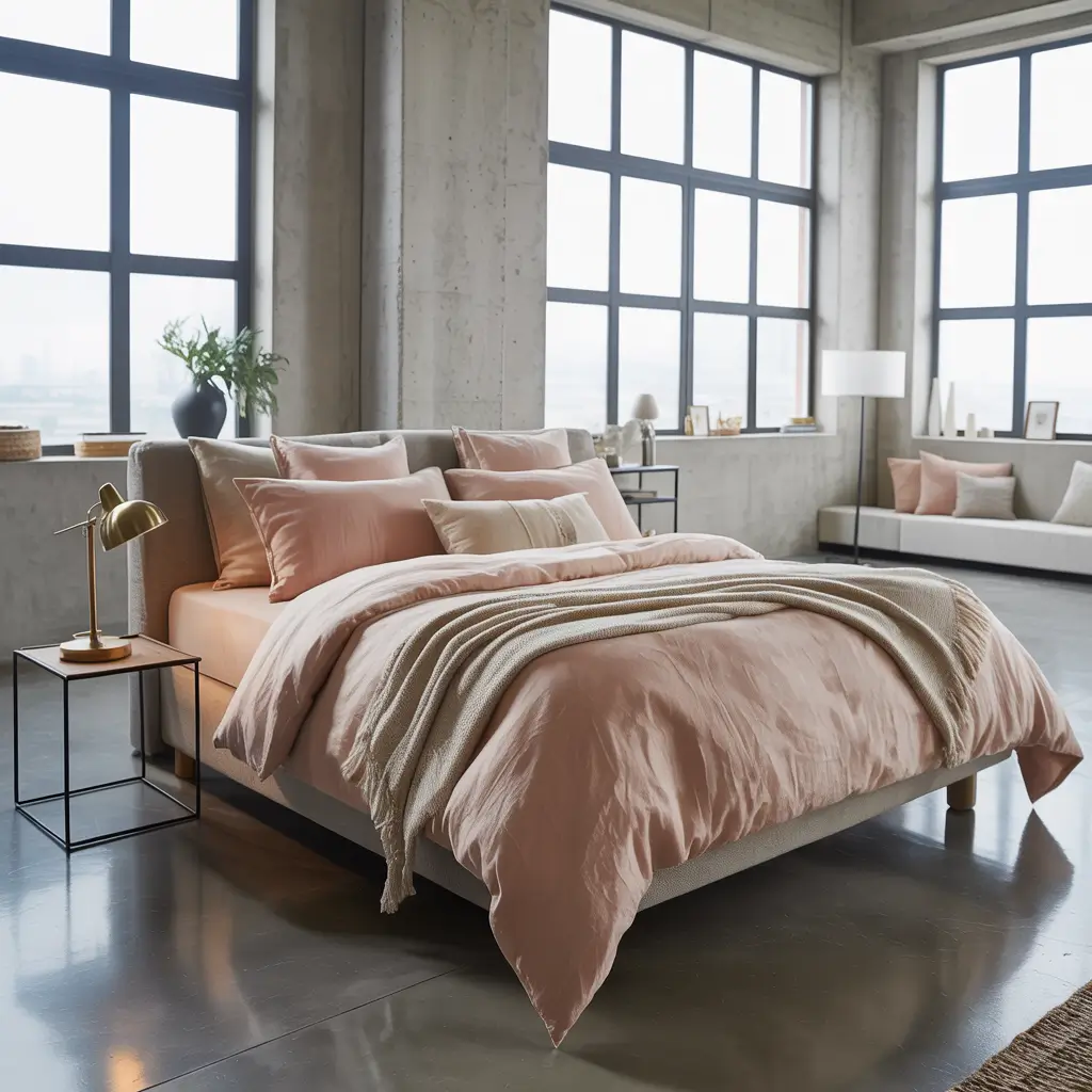 Use grey on architectural elements like exposed brick or beams, then warm it up with pink textiles and art. Define the sleeping area with a large area rug. Industrial elements like metal bed frames or concrete planters play perfectly with the pink softness.