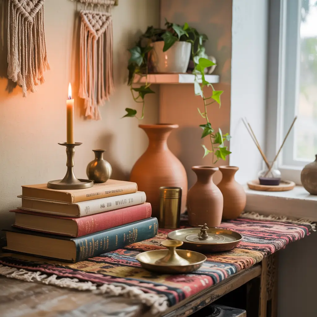 Layer, layer, layer. Start with a colorful runner or piece of fabric as your base. Add woven baskets, ceramic pots in earthy tones, and plenty of plants. Macramé anything instantly adds boho cred. I hung a small macramé planter from a wall hook above my table, and suddenly my hallway looked like it belonged in a trendy café.