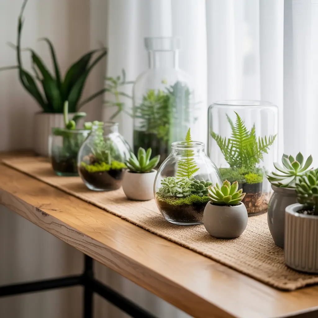 Terrariums are perfect for hallways because they’re self-contained ecosystems that barely need attention. I have three different sizes on my table, and they’ve survived longer than any houseplant I’ve ever owned. Mix these with potted plants at varying heights – a tall snake plant, medium pothos, and small succulents create a gorgeous green gradient.