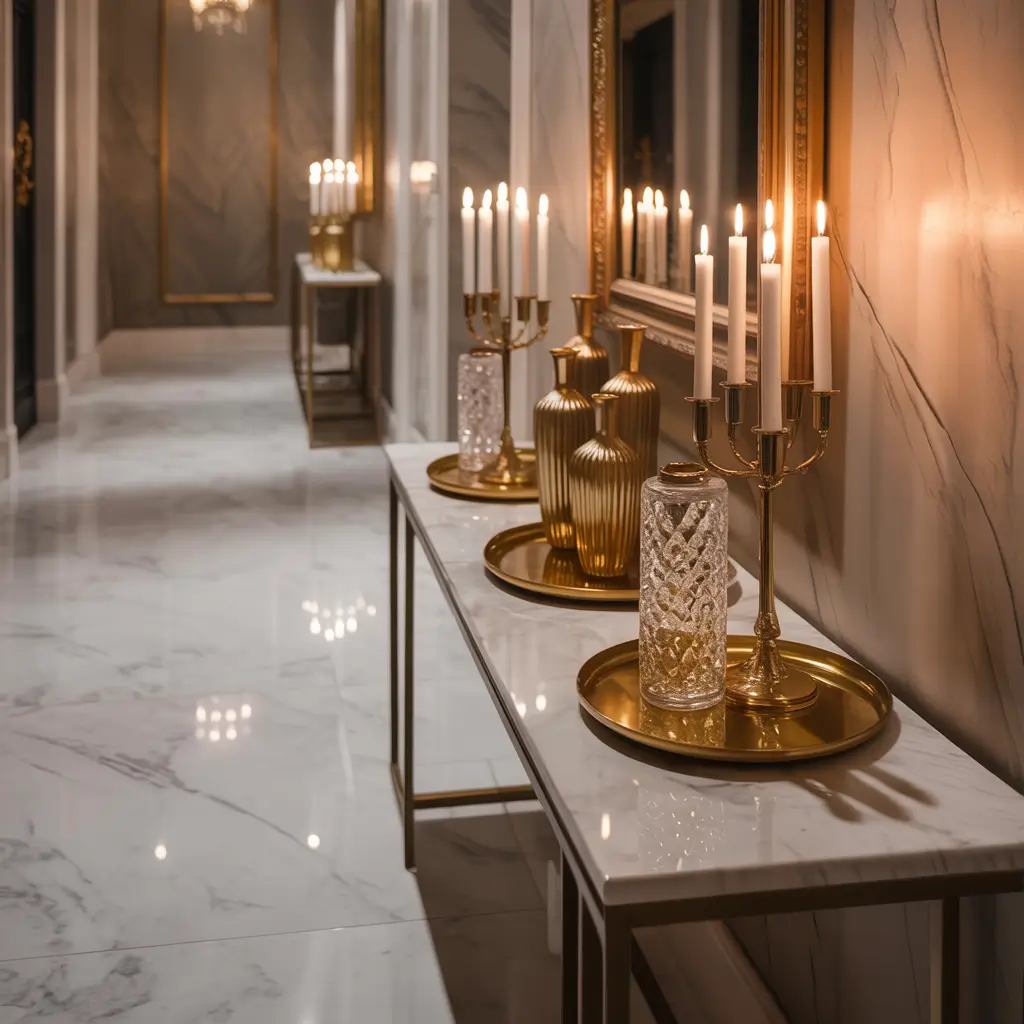 Want to feel rich even if your bank account says otherwise? Marble and gold create an instant luxury vibe that makes your hallway look like it belongs in a five-star hotel.