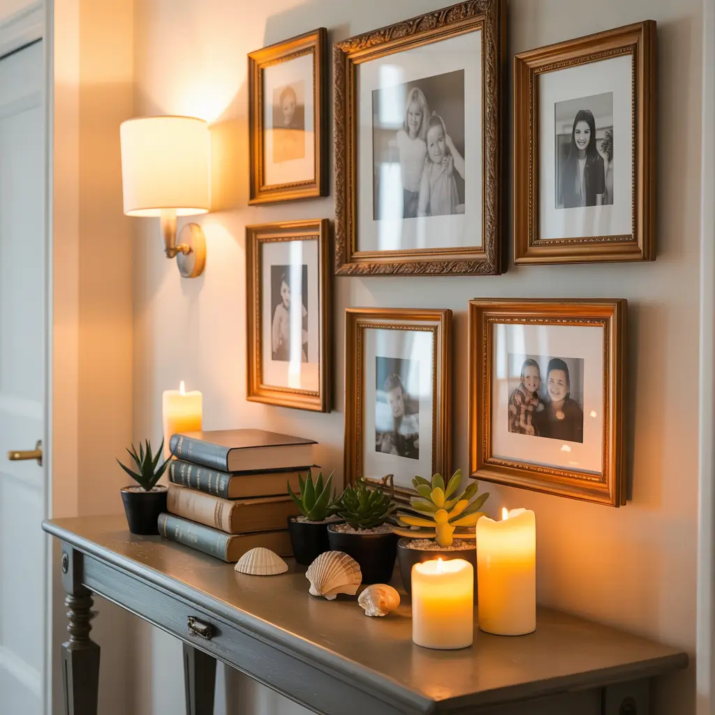 Your hallway table should tell your story, and nothing does that better than personal photos and meaningful keepsakes. This isn’t about creating a shrine to yourself (though no judgment if that’s your thing) – it’s about surrounding yourself with memories that make you smile.