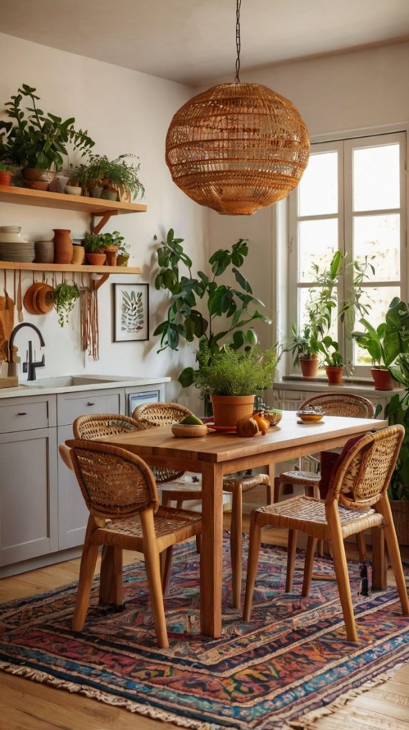 The dining area in a boho kitchen should feel like a Moroccan tea house met a California surf shack. Mix vintage chairs, add colorful cushions, hang some string lights, and suddenly Tuesday night tacos feel like a celebration.