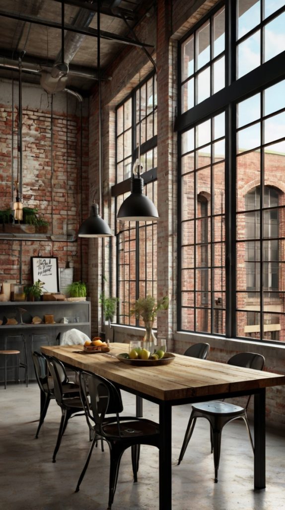 Pure industrial can feel cold. Add warmth with wooden elements, soft textiles on dining chairs, and maybe a plant or two. You want “cool urban loft,” not “abandoned factory.”