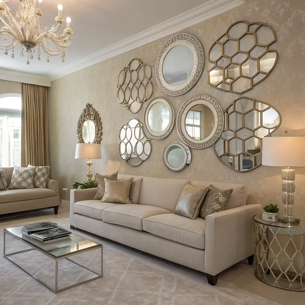 Mirrors are the unsung heroes of wall decor, especially when you’re dealing with large walls. But forget that single boring mirror – I’m talking about creating a mirror gallery that doubles as art. Mix vintage sunburst mirrors with modern geometric ones, throw in some ornate baroque-style pieces, and boom – you’ve got magic.