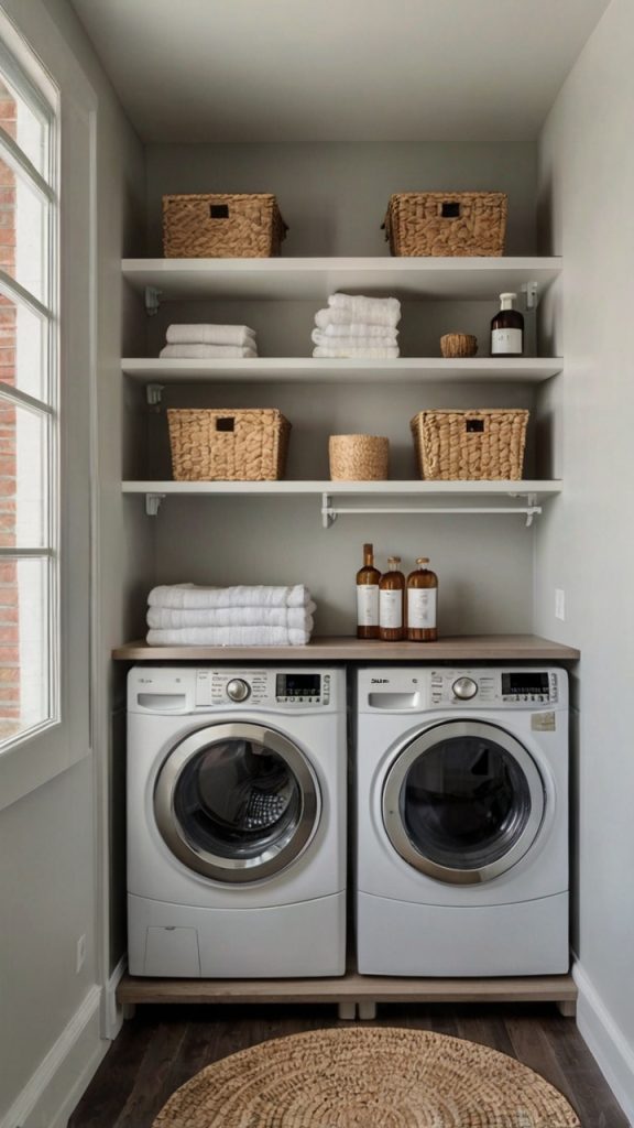 Pro tip: Use matching baskets or bins on your open shelves. They hide the chaos while still looking intentional and organized. White wicker baskets are basically the yoga pants of laundry room storage – they go with everything and make you look put-together even when you’re not.