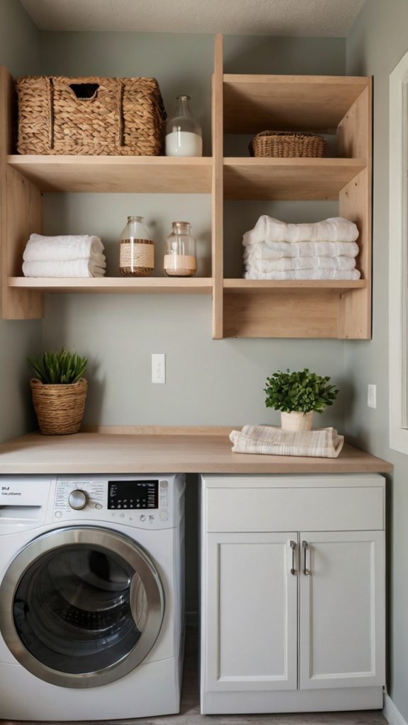Let’s start with my personal favorite—floating shelves. These bad boys are absolute game-changers, especially if you’re working with a tiny laundry room. I installed three white floating shelves above my washer last year, and it’s like I discovered extra square footage I didn’t know existed.