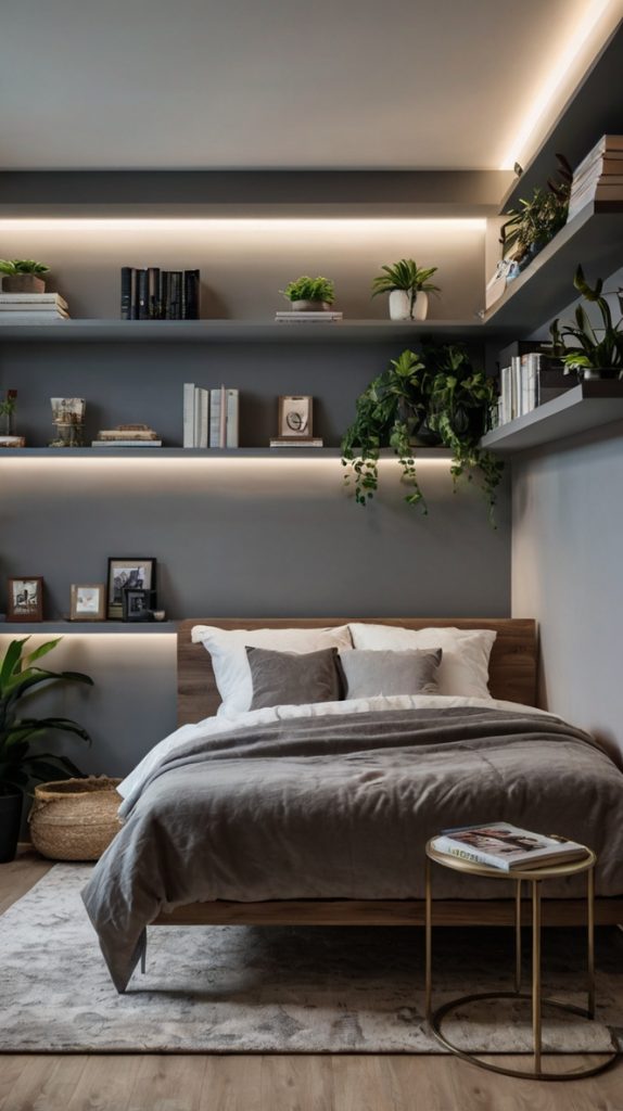 Floating shelves around a loft bed create this amazing 3D storage solution that looks like it belongs in an architecture magazine. The clean lines of modern design mean everything has its place, and nothing feels cluttered even when you’re maximizing every inch.