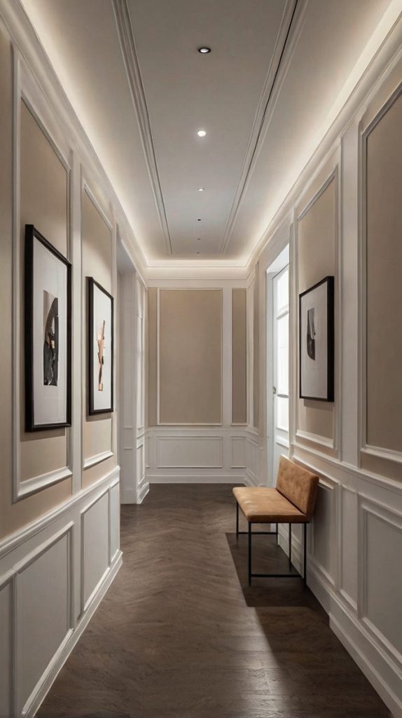 Want to add instant architectural interest? Wainscoting or decorative panels make your hallway look like you hired an expensive designer (even though you totally DIY’d it over a weekend).