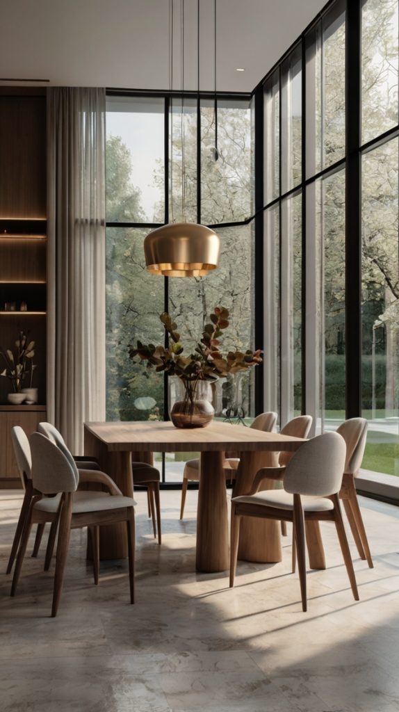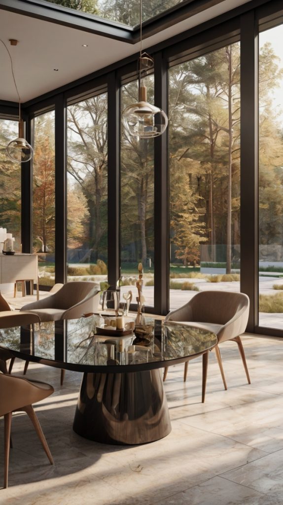 If you’ve got the view, flaunt it! Floor-to-ceiling glass walls transform your dining room into an ever-changing masterpiece where nature becomes your wallpaper.