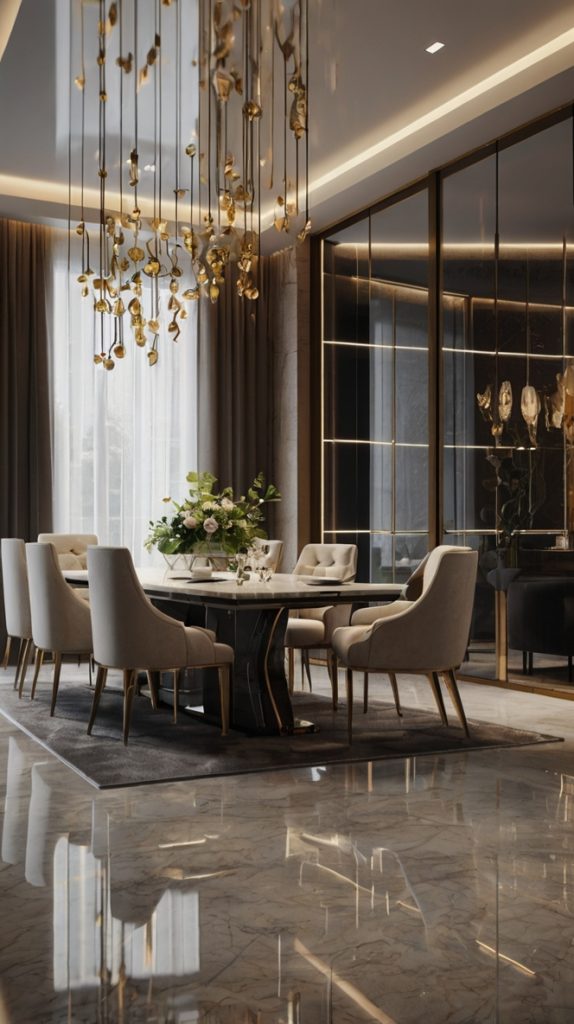 Shiny surfaces everywhere! This style is for those who love that sleek, almost futuristic luxury that makes your dining room look like it belongs in a design magazine.