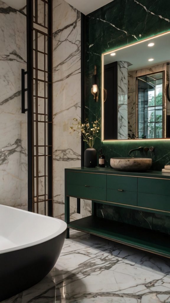 This style is all about geometric patterns, rich colors, and metallic accents. Think bold wallpaper with repeating patterns, furniture with strong angular lines, and mirrors everywhere. The color palette typically includes deep jewel tones – emerald, sapphire, ruby – paired with black, white, and lots of gold or brass.