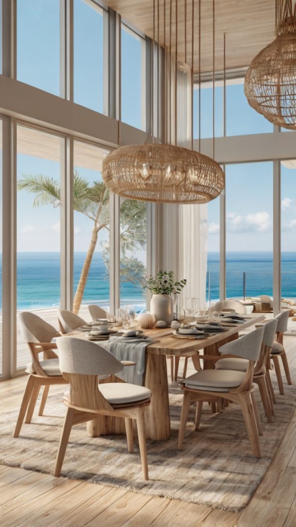 The palette stays light and airy – whites, sand tones, soft blues, and maybe some weathered gray wood. But the materials elevate it beyond typical beach house fare. Think white oak tables, linen-upholstered chairs, and perhaps some rope details done in an elegant way (not your typical nautical kitsch).