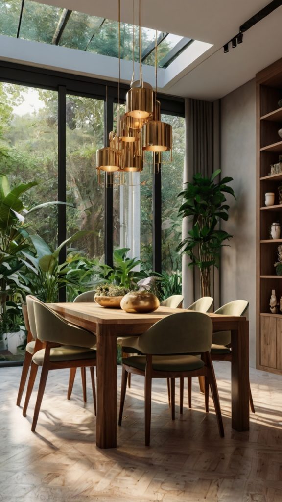 Pair all this greenery with natural materials – rattan chairs, a wood table, maybe stone accents – and suddenly your dining room feels like the most expensive greenhouse restaurant you’ve ever been to. Just remember: with great plants comes great responsibility. Dead plants definitely don’t scream luxury.