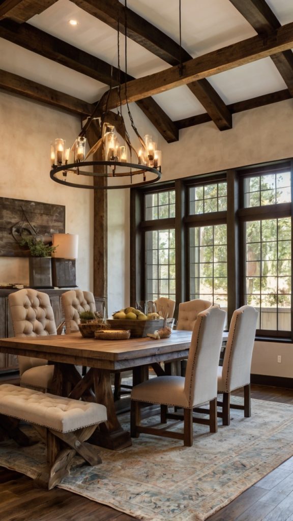 Start with a massive reclaimed wood table – the kind that looks like it has stories to tell. But instead of mismatched chairs, go with something unexpected like modern upholstered seats or even classic wingbacks. Add a statement chandelier (maybe iron with crystal accents), and suddenly your farmhouse went to finishing school.
