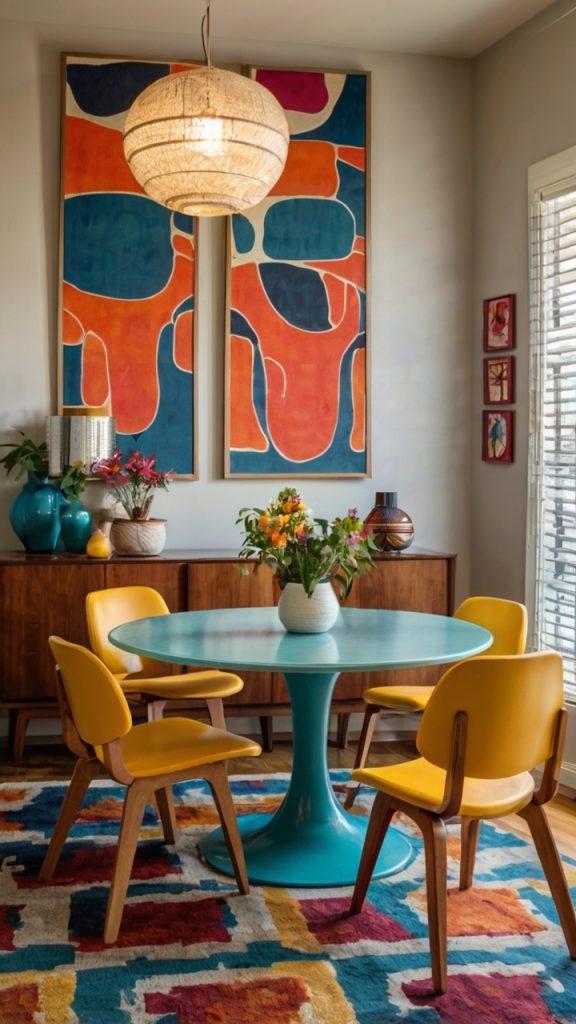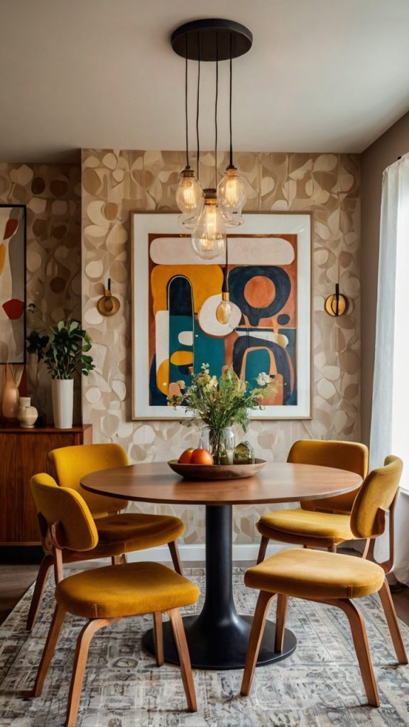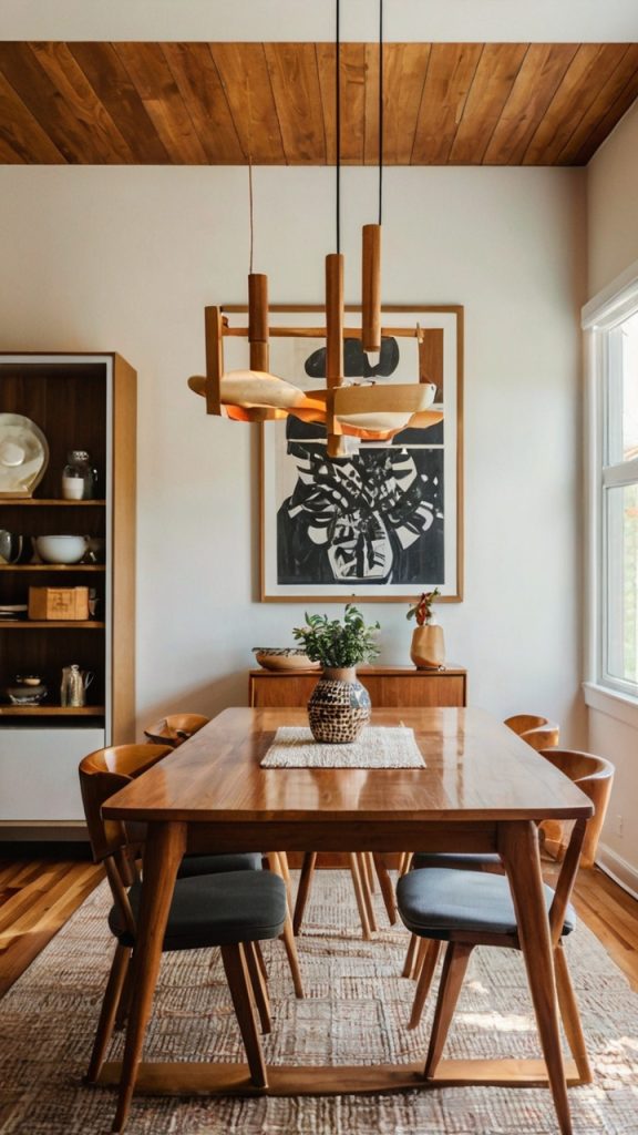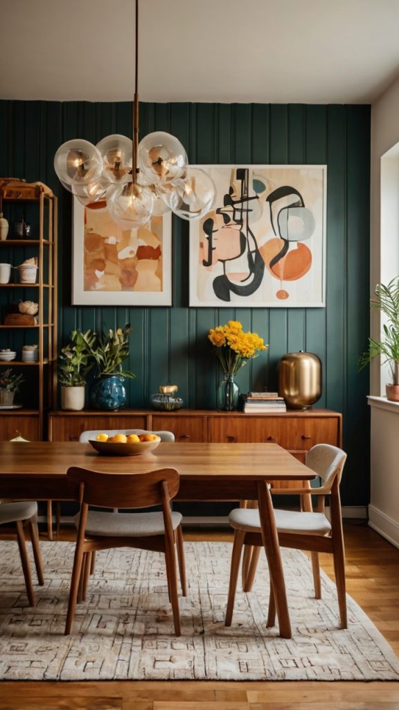 Blank walls in a dining room are missed opportunities. But here’s the thing about mid century modern art – it doesn’t need to be expensive originals. I’ve found amazing prints at thrift stores, downloaded high-res images from museum collections, and even framed vintage album covers.