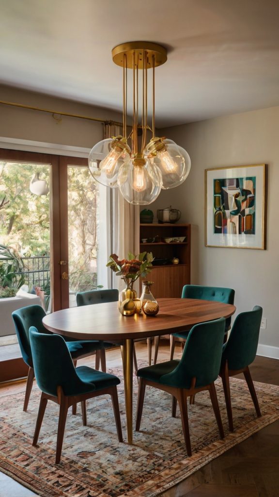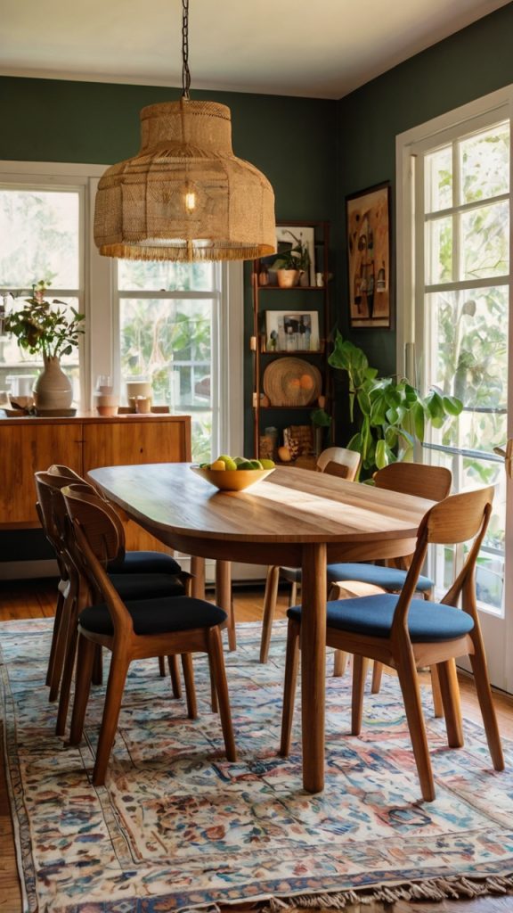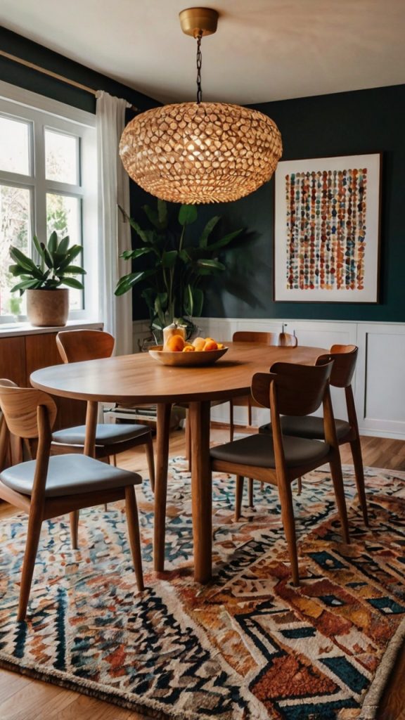 Geometric patterns in burnt orange or gold absolutely nail the mid century vibe. My current rug has an abstract pattern that looks like it came straight from a Palm Springs time capsule. Size matters here – go at least 24 inches wider than your table on all sides so chairs stay on the rug when pulled out.