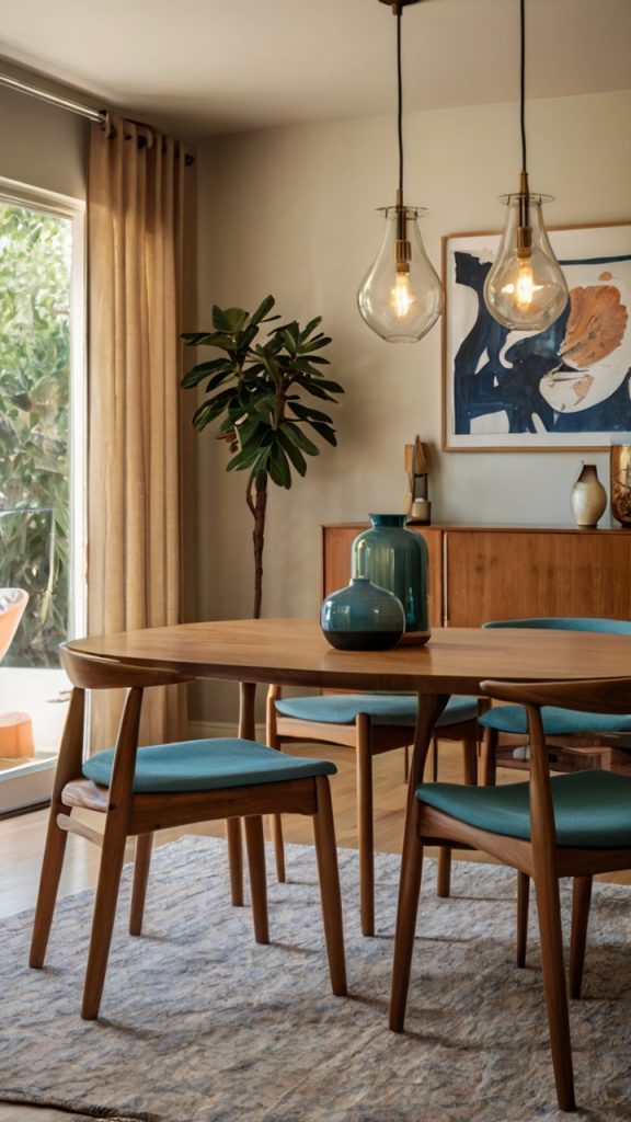 Nothing screams mid century modern quite like a walnut dining table with tapered legs. I scored mine at an estate sale for $200, and it’s been the centerpiece of countless dinner parties. The secret sauce here? Pairing that warm wood with chairs that pop.