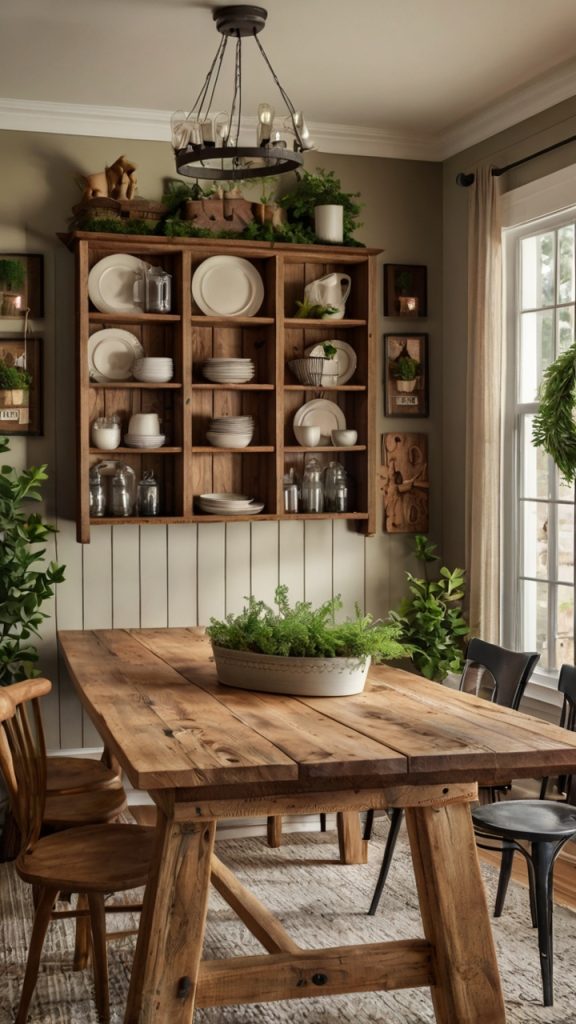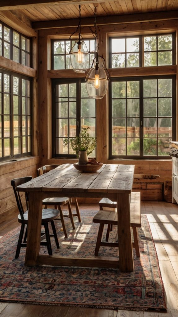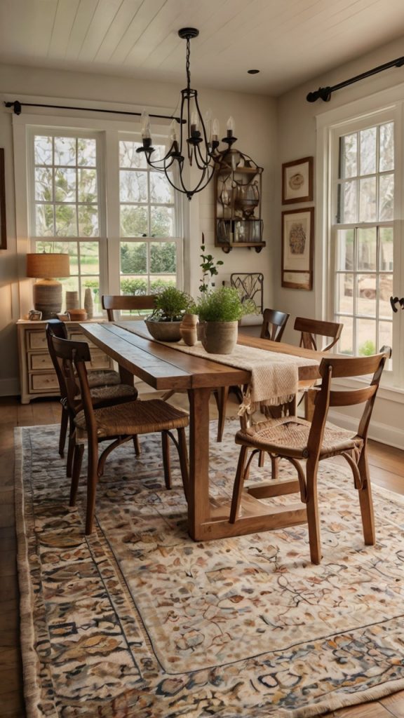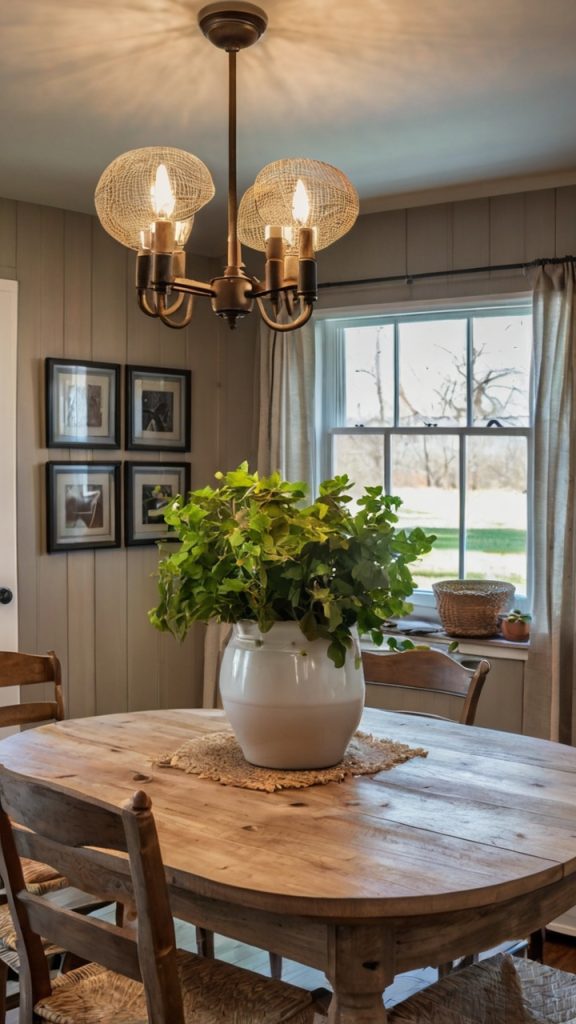 Lighting can make or break your dining room, and vintage farmhouse fixtures bring instant personality. I’m talking about statement chandeliers that become conversation starters.
