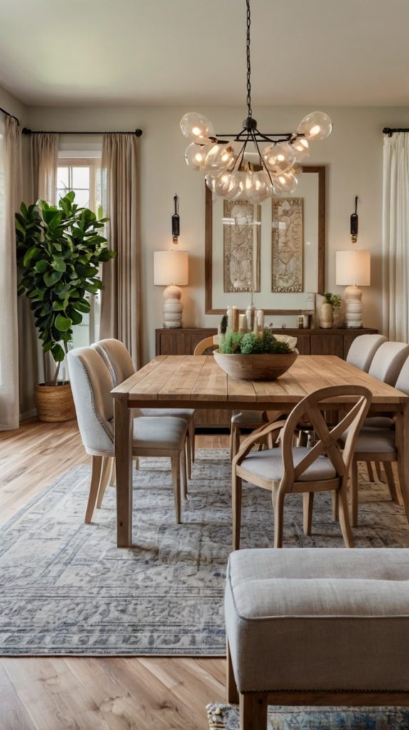 Textiles soften hard surfaces and add warmth that makes dining rooms inviting. The right rug anchors your entire space while protecting floors from chair scratches.
