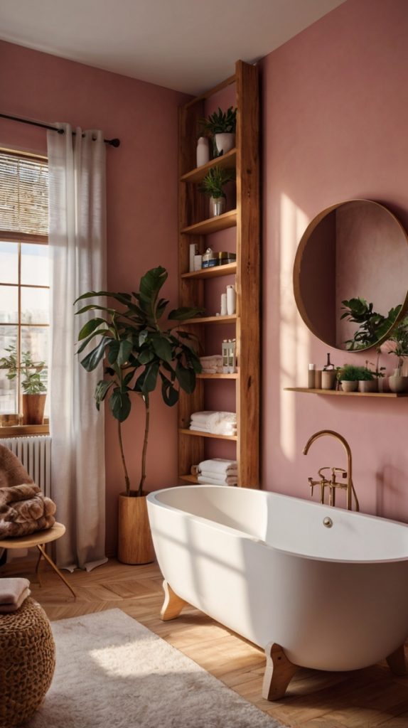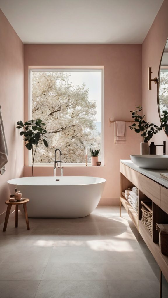 Pink Bathroom with Natural Wood Accents