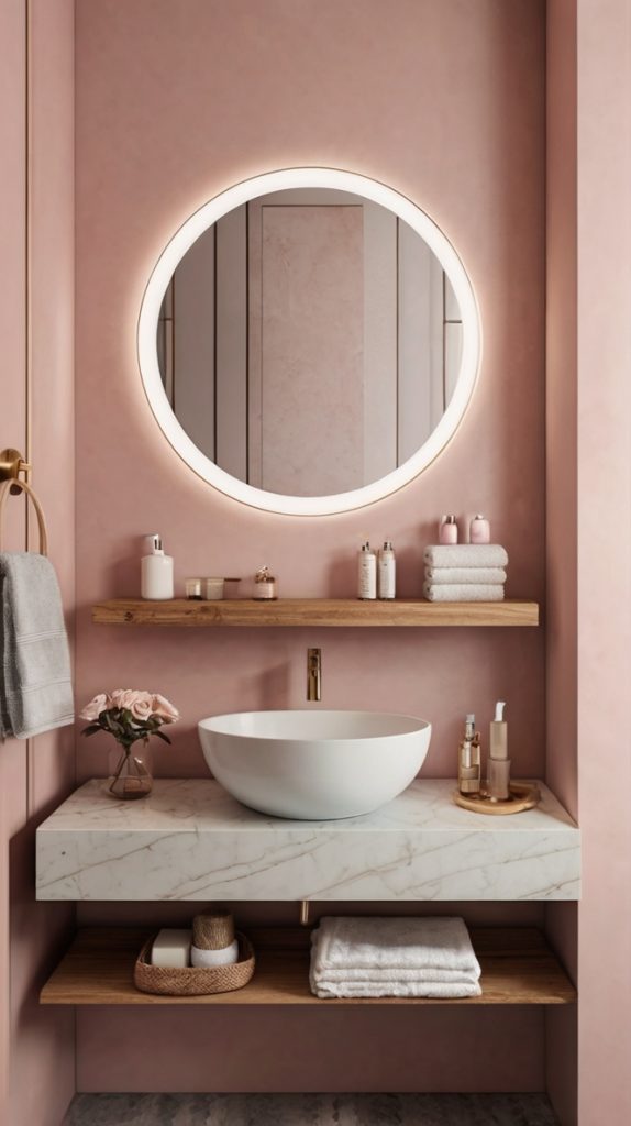 I’ve seen this done brilliantly with a live-edge wood vanity top against pink walls, and it looked like something straight out of a design magazine. The wood grounds the pink and adds an earthy element that makes the whole space feel more livable and less like a showroom.