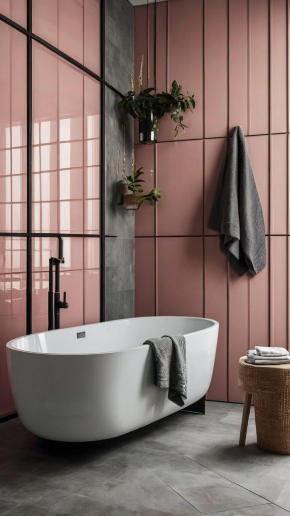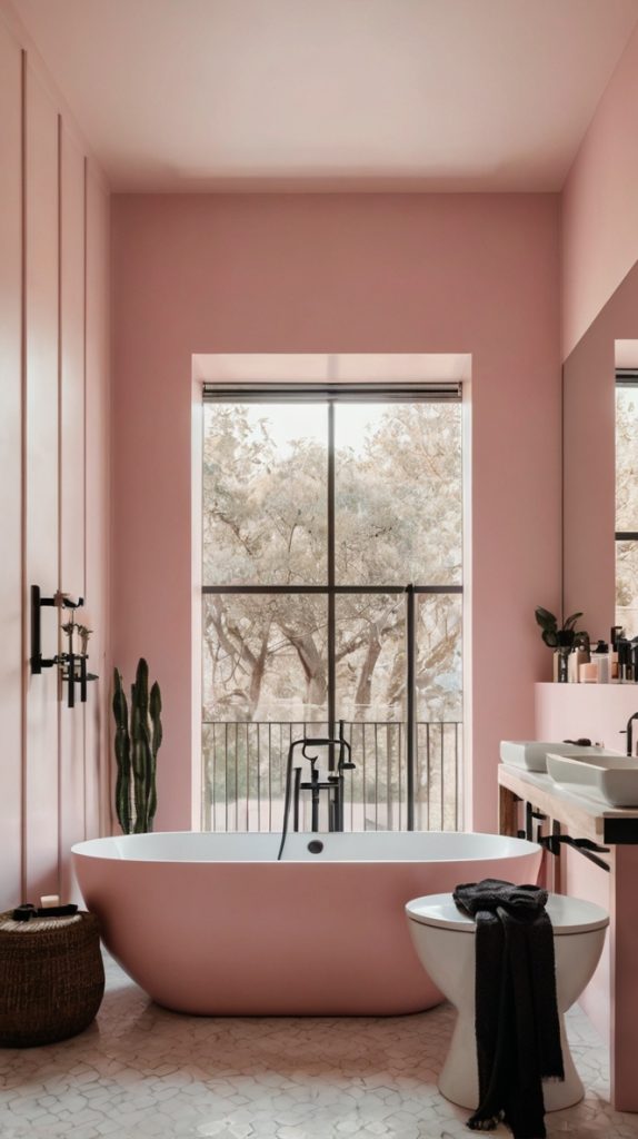 Start with a base shade – maybe a warm blush – then layer in deeper and lighter pinks through towels, artwork, and accessories. The result feels intentional and calming rather than matchy-matchy. Think of it as tonal dressing for your bathroom.