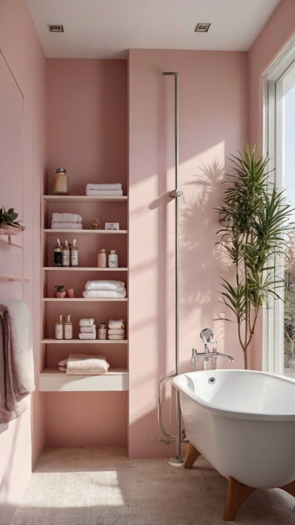 Pink Bathroom with Floating Shelves