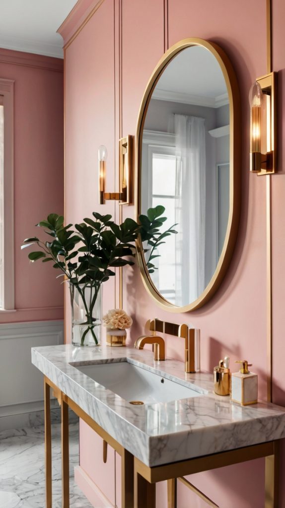 Last but definitely not least, let’s talk about gold mirrors in pink bathrooms. A stunning gold mirror can be the jewelry that completes your bathroom’s outfit. Whether you go for ornate vintage or sleek modern, the right gold mirror elevates the entire space.