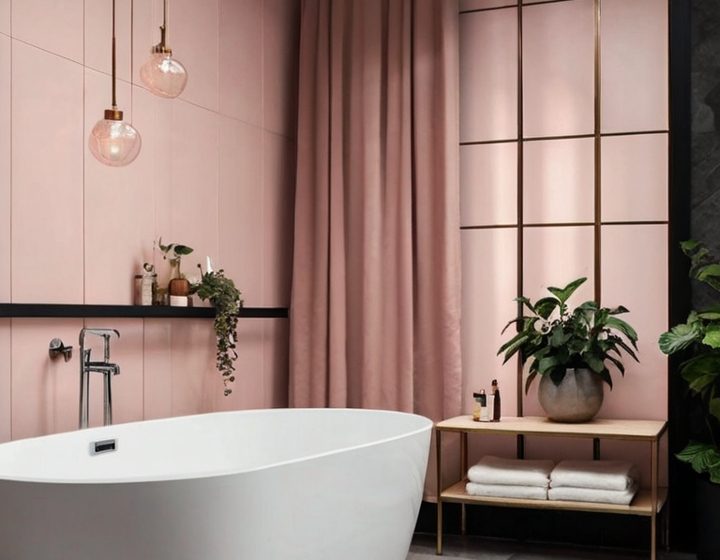 Start with a base shade – maybe a warm blush – then layer in deeper and lighter pinks through towels, artwork, and accessories. The result feels intentional and calming rather than matchy-matchy. Think of it as tonal dressing for your bathroom.